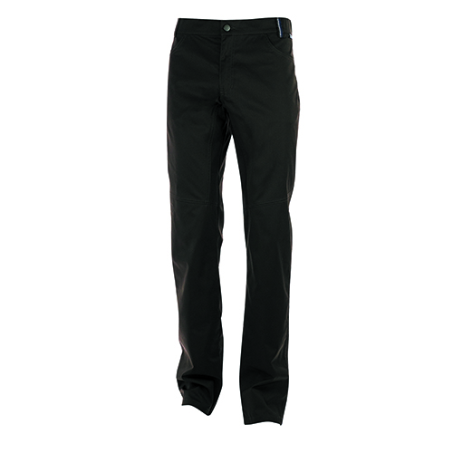 Pantalon ergonomique. Ceinture droite et passant sur le devant gauche avec application de twill en jacquard. Braguette zippée. Bouton rivet. 2 poches cavalières. 1 poche ticket. 2 poches revolver. Réhausse dos. Empiècement d'aisance à l'entrejambe.