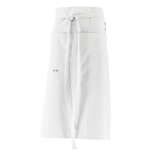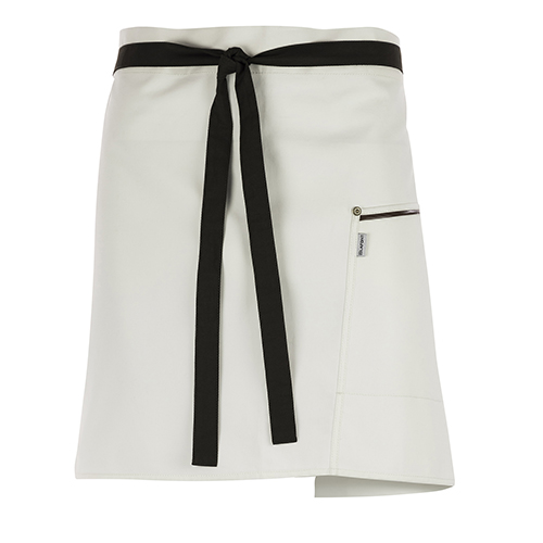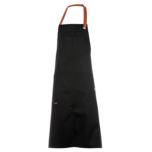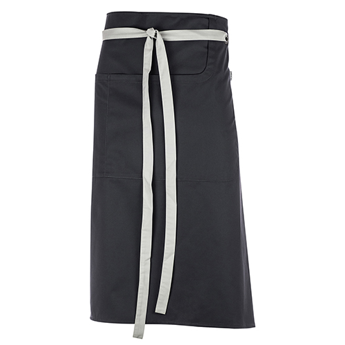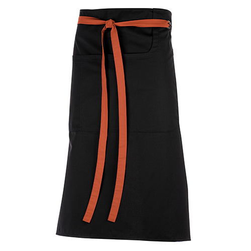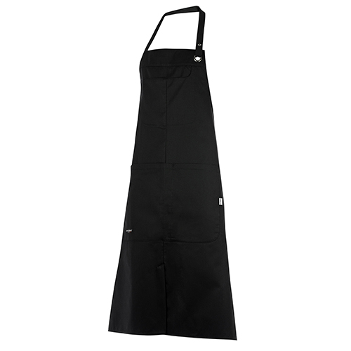 ablier à bavette. Lien réglable autour du cou. 1 poche à bavette et 1 grande poche ventrale double compartiment.