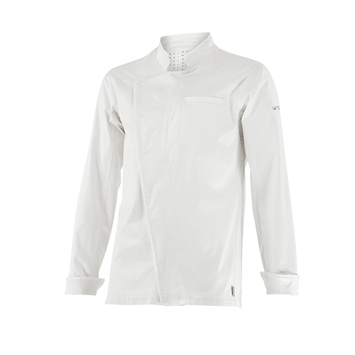 Col officier • Fermeture par grippers à calotte de couleur • Manches montées • Bas de manches avec fentes arrondies • 1 poche poitrine avec compartiment stylo • Découpe dos • Liseré sur col, bas de manches et poche poitrine.